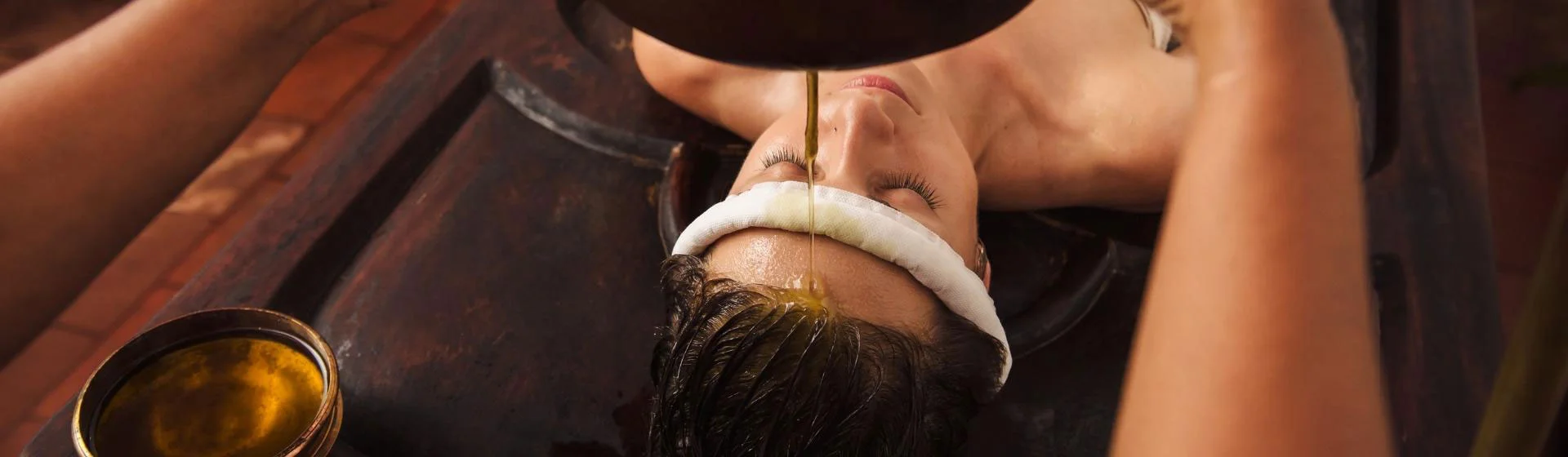 The dripping of slow stream of medicated warm oil / butter milk / milk / decoction on the forehead (at the place of ajna chakra and stapani marma) Benefits :It’s highly recommended for Migraine, Sinusitis, Insomnia , Anxiety, Stress, High blood pressure, Cerebrovascular iseases , Skin and hair problems , Neurological disorders and also relaxed hypothalamus, Normalise hormon functions like Thyroid, PCOD and also regulates penial gland function